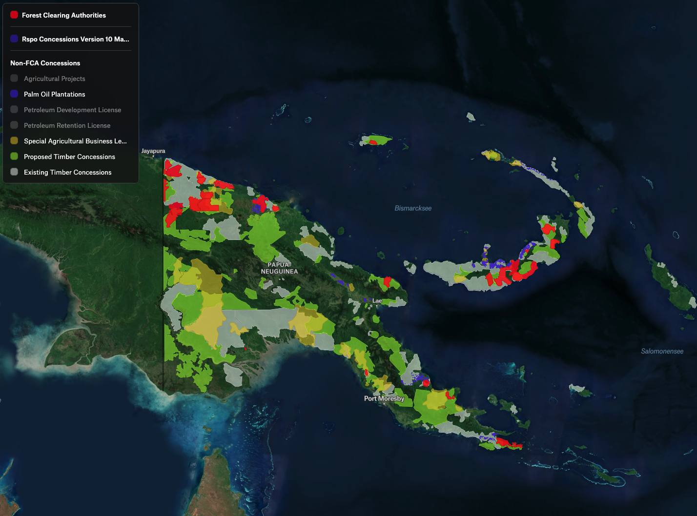 Almost the whole country of PNG is today covered by logging or palm oil concessions by now.
